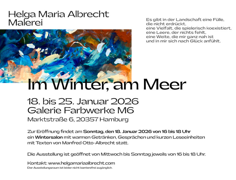 Zur Eröffnung der Ausstellung veranstalten wir am Sonntag, den 18. Januar 2026 von 16 bis 18 Uhr einen Wintersalon mit warmen Getränken, Gesprächen und kurzen Leseeinheiten mit Texten von Manfred Otto-Albrecht.